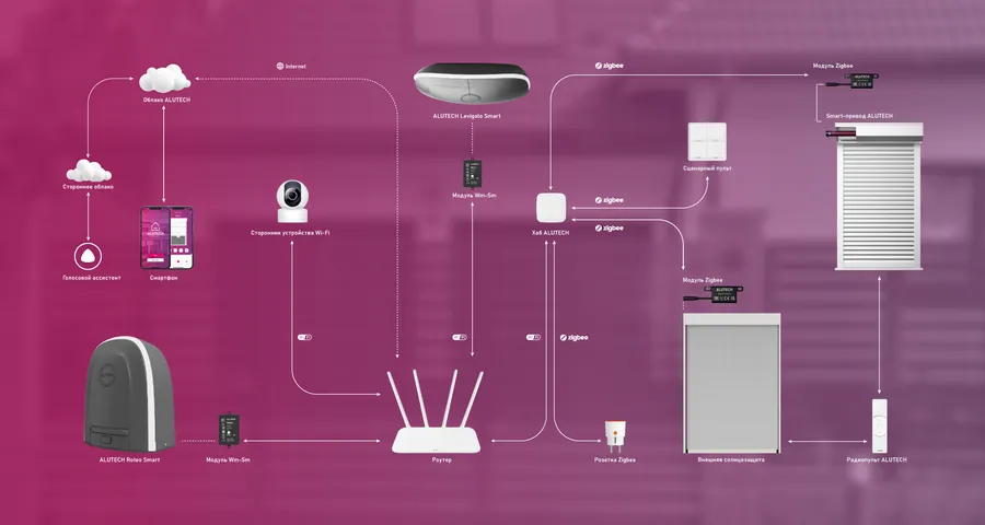 ALUTECH Smart объединяет устройства Zigbee и Wi-Fi в единую экосистему для удобного управления. Чтобы система работала корректно, требуется стабильное подключение к интернету.