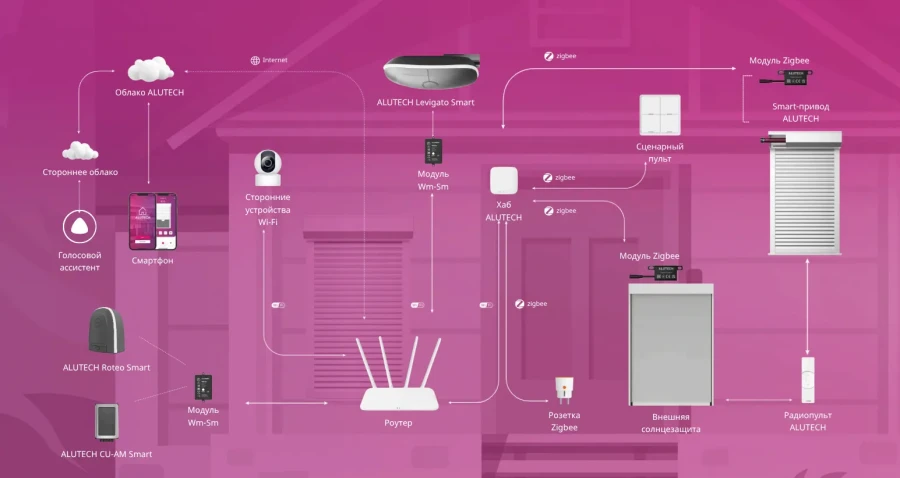 Роллеты, солнцезащита и другие Zigbee-устройства подключаются через беспроводной хаб ALUTECH. Хаб создает сеть Zigbee, управляет устройствами и координирует их работу. А локальные сценарии выполняются даже без интернет-соединения.